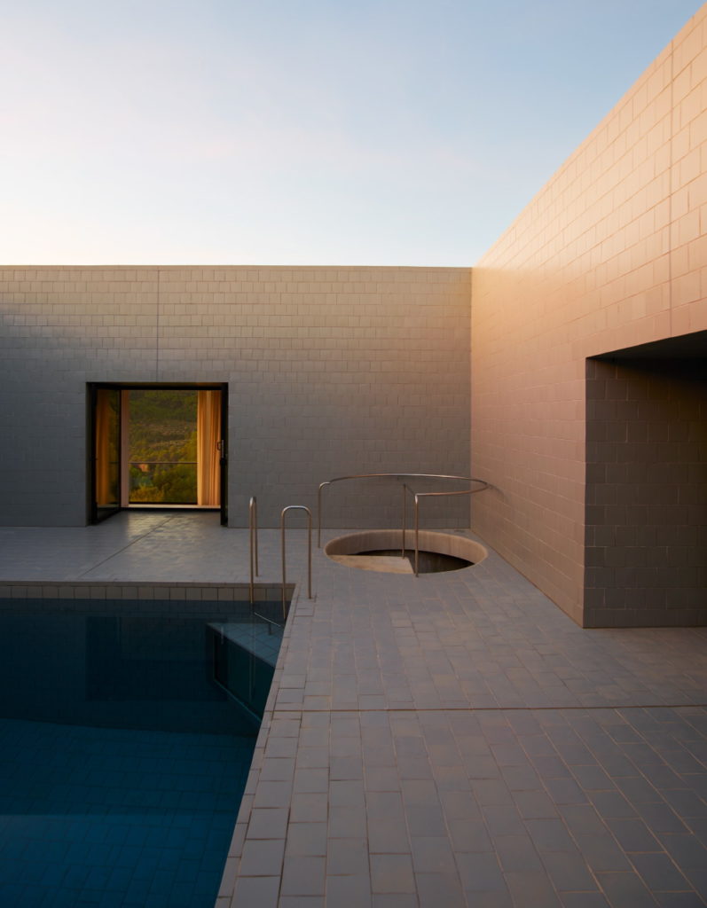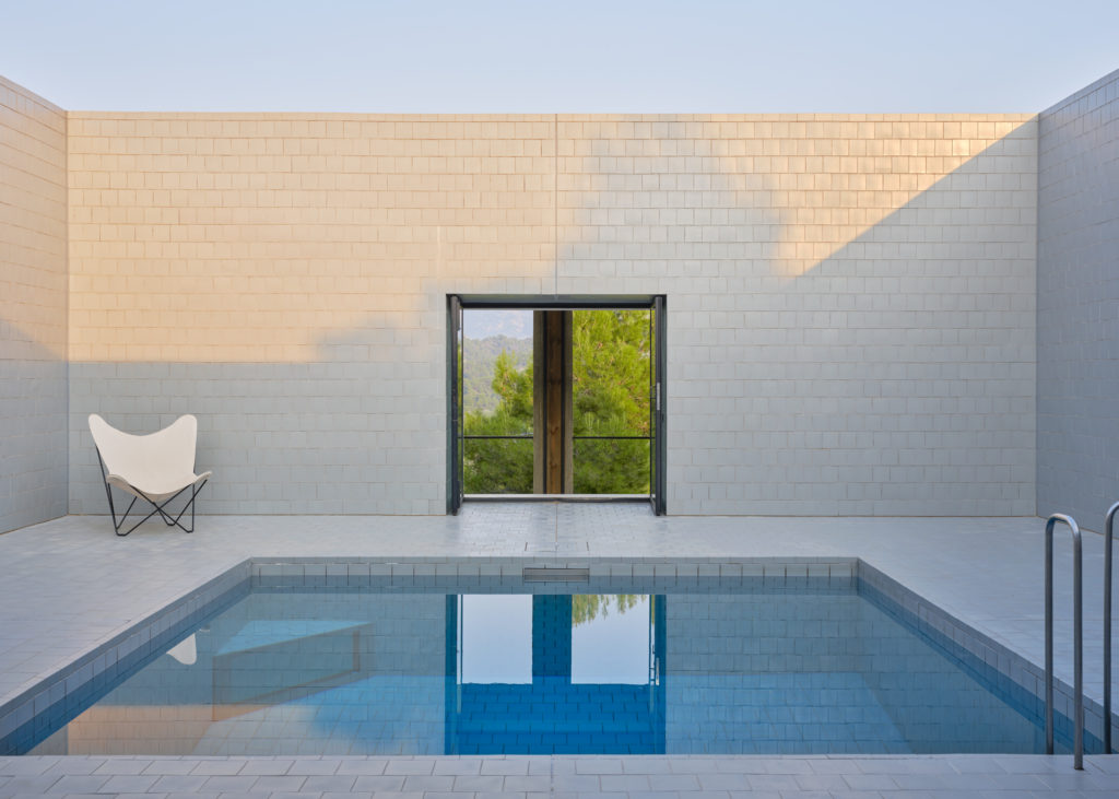 Hecha íntegramente en hormigón, su diseño es perfectamente simétrico y homotético. Solo Pezo von Ellrichshausen se inspira en las casas con patio mediterráneas, con una piscina central que ofrece tanto la oportunidad de refrescarse como un espacio para compartir entre los residentes.