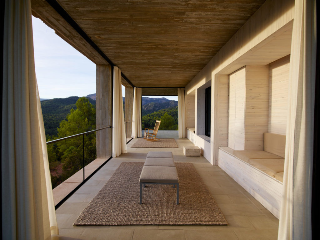 Alrededor de este patio central se sitúan los espacios de vida, organizados junto a la veranda con ventanas de altura completa que se pliegan para convertirse en un balcón al aire libre.
